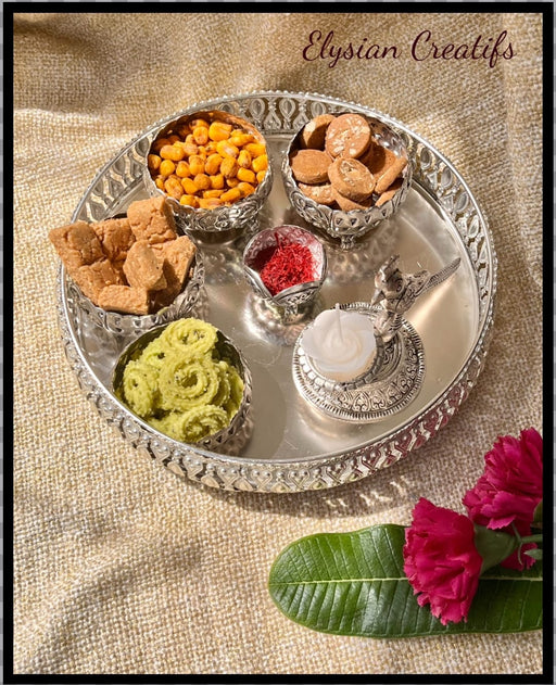 Elysian creatifsIndulge in the exquisite luxury of the German Silver Tray, complete with 4 delicately crafted small bowls, a refined small Kumkum tray, and a sophi...