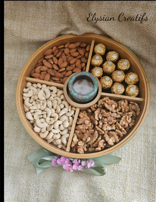 View full detailsAssorted Wooden Round Dry Fruit Gifting Box With Dried Fruits And Wrapping With Net And Bow