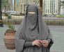Achromatic Grey color suits women of any age, its versatile and dynamic. Our 3 piece Jilbabs with elasticated sleeves are perfect for outdoor and indoor wear It provides full coverage of the body with a free size loose fit so you remain care-free when out and about. Made with premium quality Nada fabric, the Jilbabs are soft and airy and perfect for both summers and winters. Our Jilbab come with a tie-back top Khimar featuring elasticated sleeves, an elasticated skirt that can be easily adjusted according to your height and a standard niqab with tie-backs to cover the face. himar Front 44 in