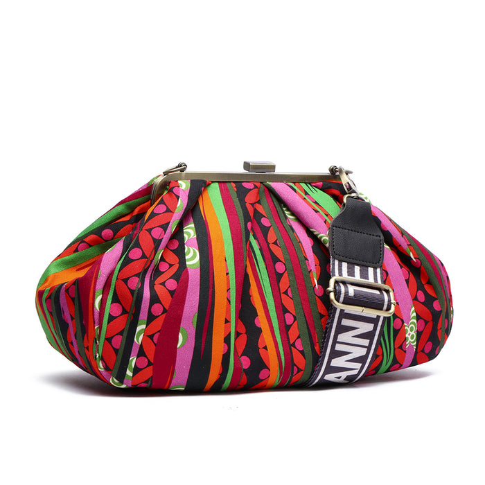 Small cotton clutch Fun Bamboos is our bestseller. The textile pattern was inspired by an incredible oriental colorful bazaar. The combination of different shades of orange, red, purple, and green makes the pattern amazing vibrant. This bag can be worn for any occasion. The printed long shoulder stripe will allow you to carry it on your shoulder. Perfect gift idea.
