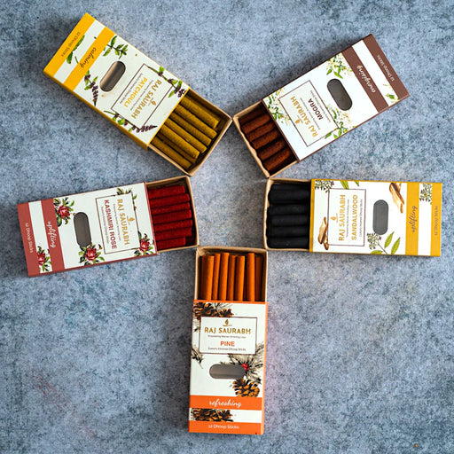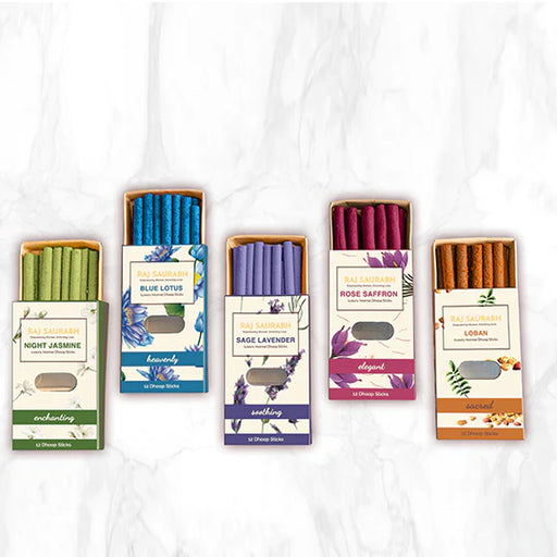 Raj UphaarGet the complete experience of Loban, Sage Lavender, Blue Lotus, Rose Saffron and Night Jasmine by purchasing a set of 5 Fragrance Dhoop Sticks in ...