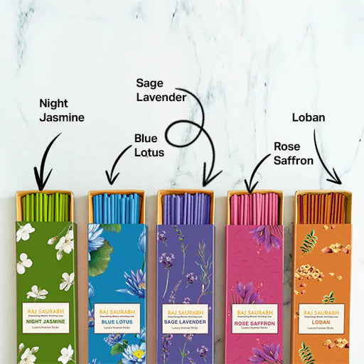 Raj UphaarGet the complete experience of Loban, Rose Saffron, Sage Lavender, Blue Lotus and Night Jasmine by purchasing a set of 5 Fragrance Incense Sticks i...