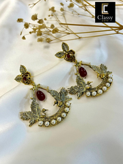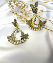 These exquisite earrings seamlessly blend the graceful allure of a bird with the intricate charm of floral patterns. Handcrafted with precision, they feature a mesmerizing combination of stones and pearls.