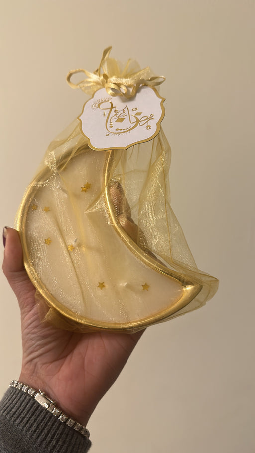 SoyJoy CandlesHandpoured candle in a ceramic crescent shaped trinket tray, using natural soy wax and non toxic amber oud fragrance. 5 inches candle tray in Gold