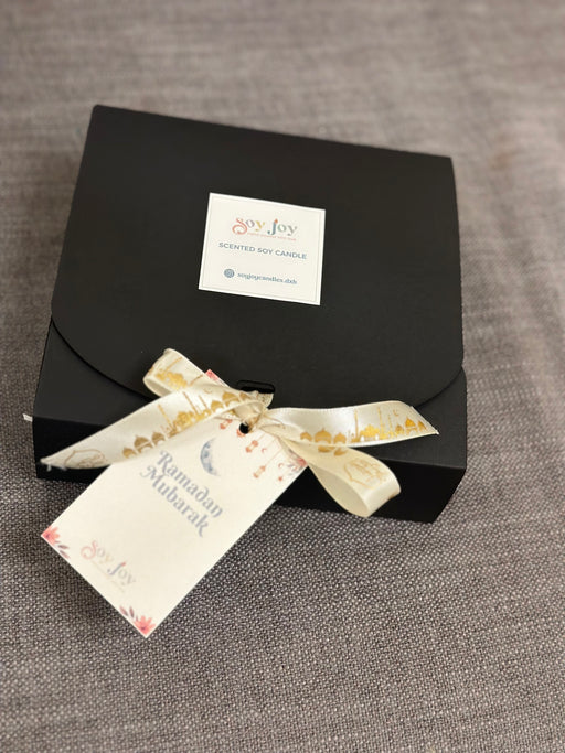 SoyJoy CandlesThe crescent shaped soy candle paired with an Islamic themed bookmark for an aromatic, budget friendly gift option. Box size 16cm x 16 cm Black gif...