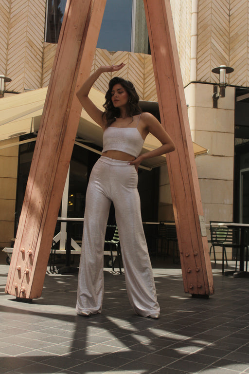 The Fashion HouseWide-leg pants with stretchy waist , Spaghetti-Strap Crop Top Product type : Metallic Lycra Two piece Set Color : Color Silver Rose