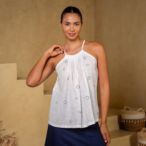 EscaleA sophisticated white top with eye-catching hand-embroidered circles, designed in linen for a perfect balance of fashion and comfort