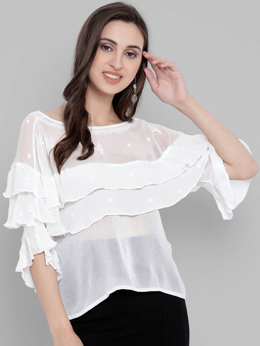 T' Naaz - Naaz TabassumChannelling prairie romance, a blouse of sheer georgette fabric is fashioned with the overlapping ruffles circling from front to back and the ruffl...