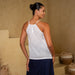 A sophisticated white top with eye-catching hand-embroidered circles, designed in linen for a perfect balance of fashion and comfort