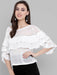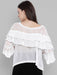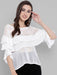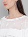 Channelling prairie romance, a blouse of sheer georgette fabric is fashioned with the overlapping ruffles circling from front to back and the ruffled bell sleeves balance the style further. Delicate embroidery traces the neckline and coin like motifs enhancing the top.